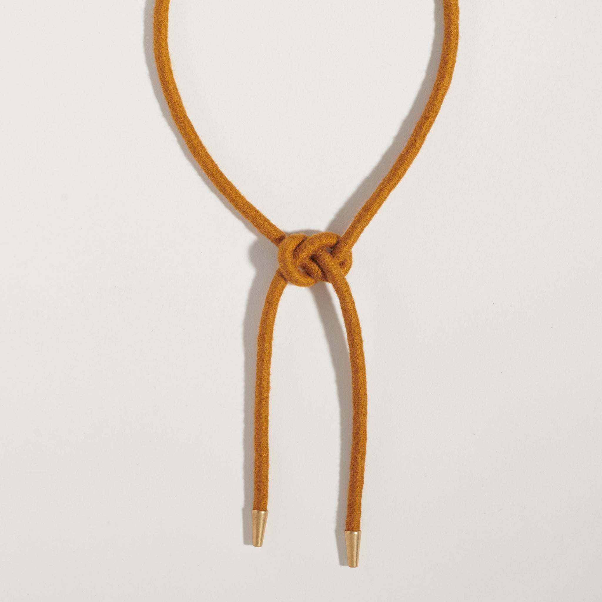 Our thinnest cording is hand-wrapped and formed into a square knot and finished with brass accents.