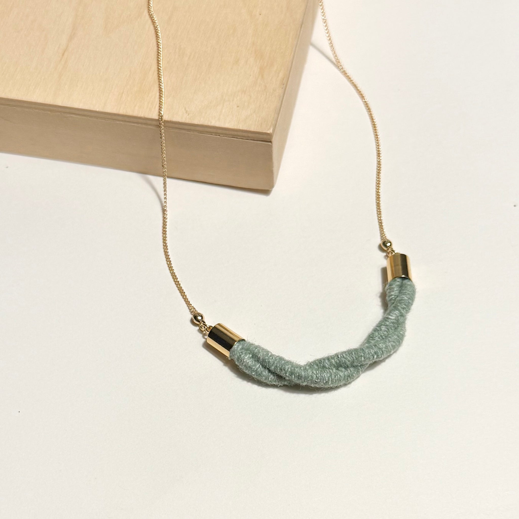 Connect your favorite fiber knot or twist with a delicate chain. Wear as a singular pendant or layer with other chains. Shown in Celedon Silky Wool.
