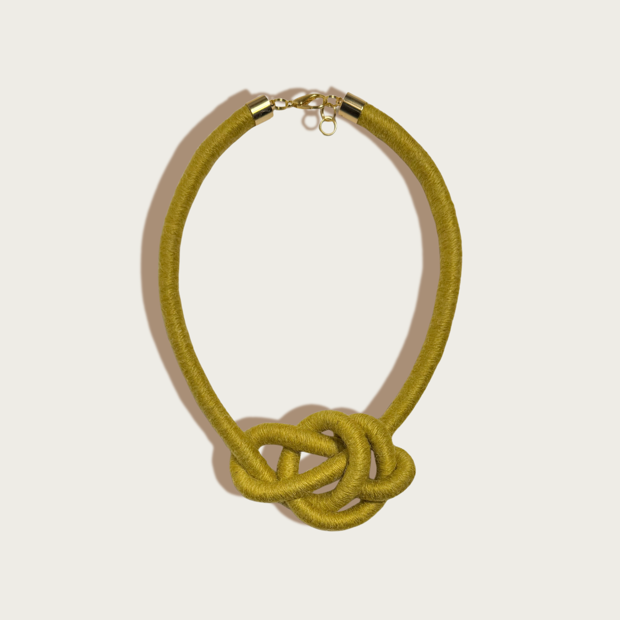 Connect your favorite colors in this asymmetrical water bowline knotted necklace. Shown and modeled in Fawn Lyocell. Modeled in a different color for scale only.