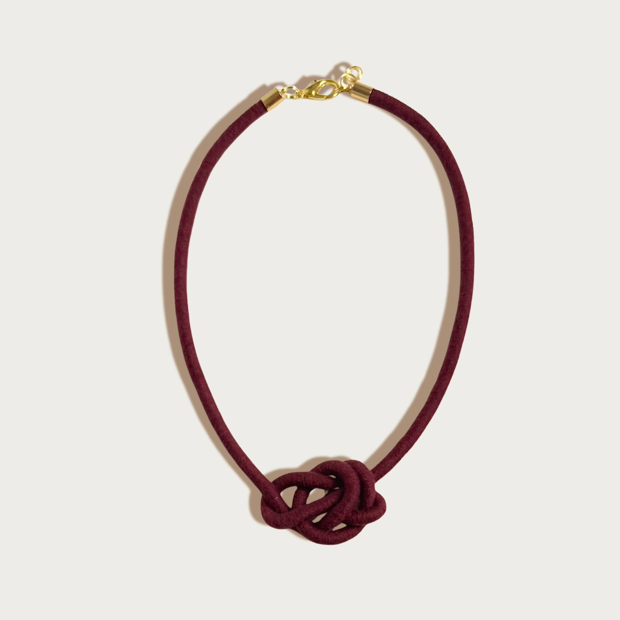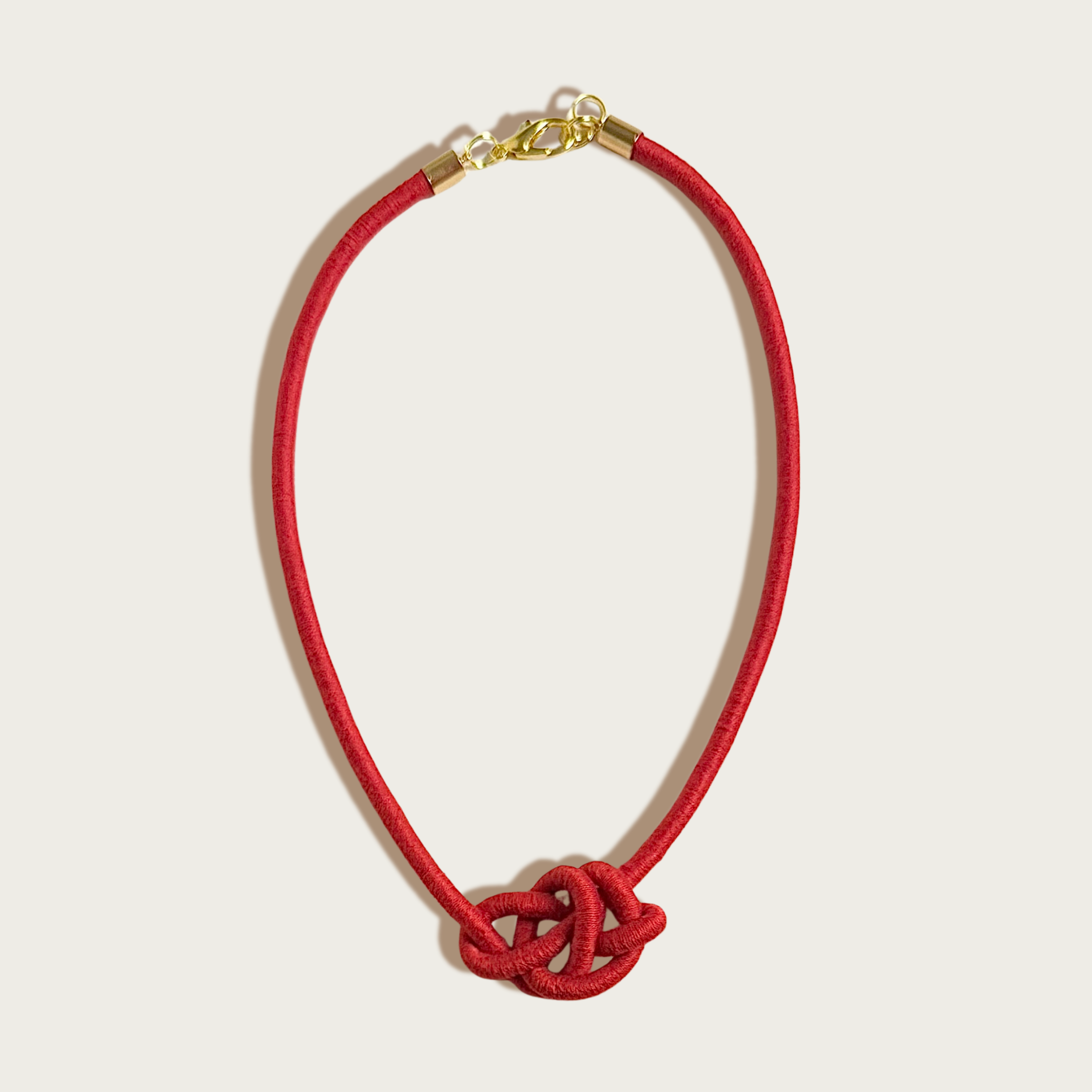 The Petit Water Bowline Necklace is based on the #1 top-selling namesake piece. Connect your favorite colors in this asymmetrical water bowline knotted necklace. Shown in Red Mahogany, Latte, and Tomato yarns. The original Water Bowline Necklace is shown for scale only.