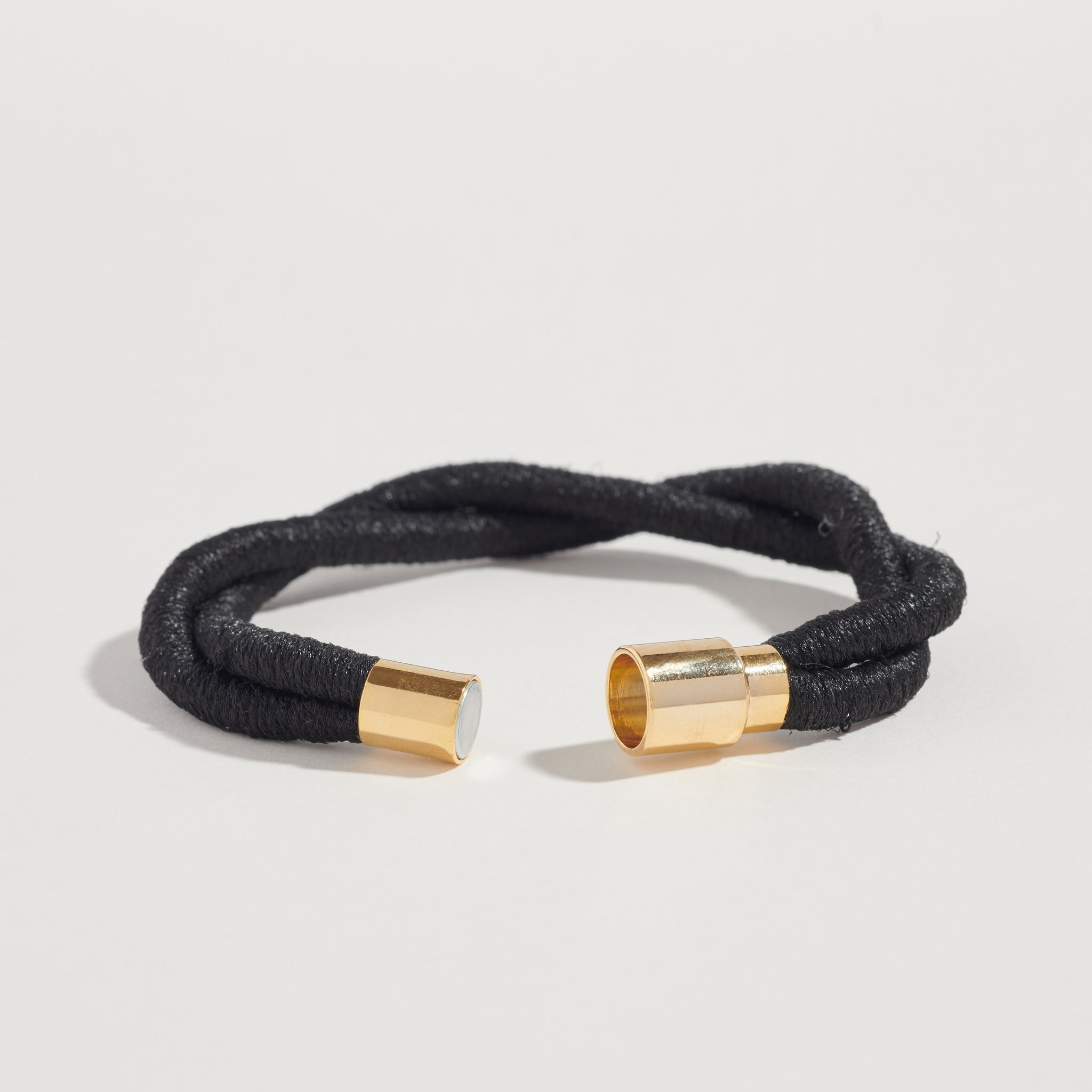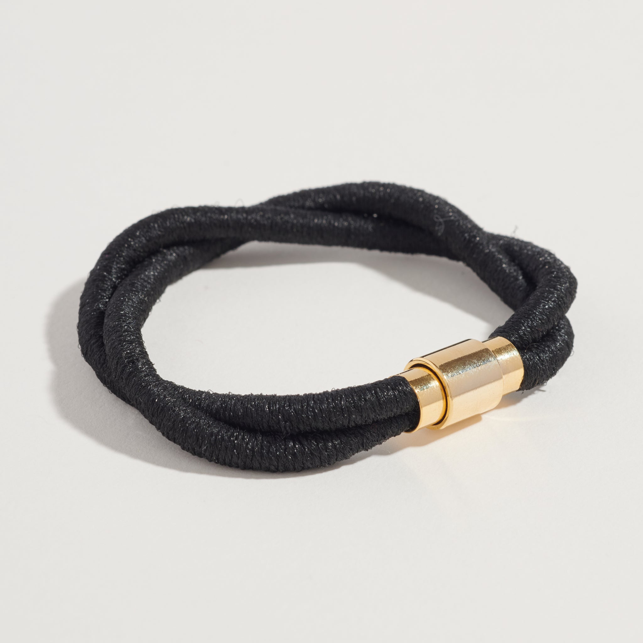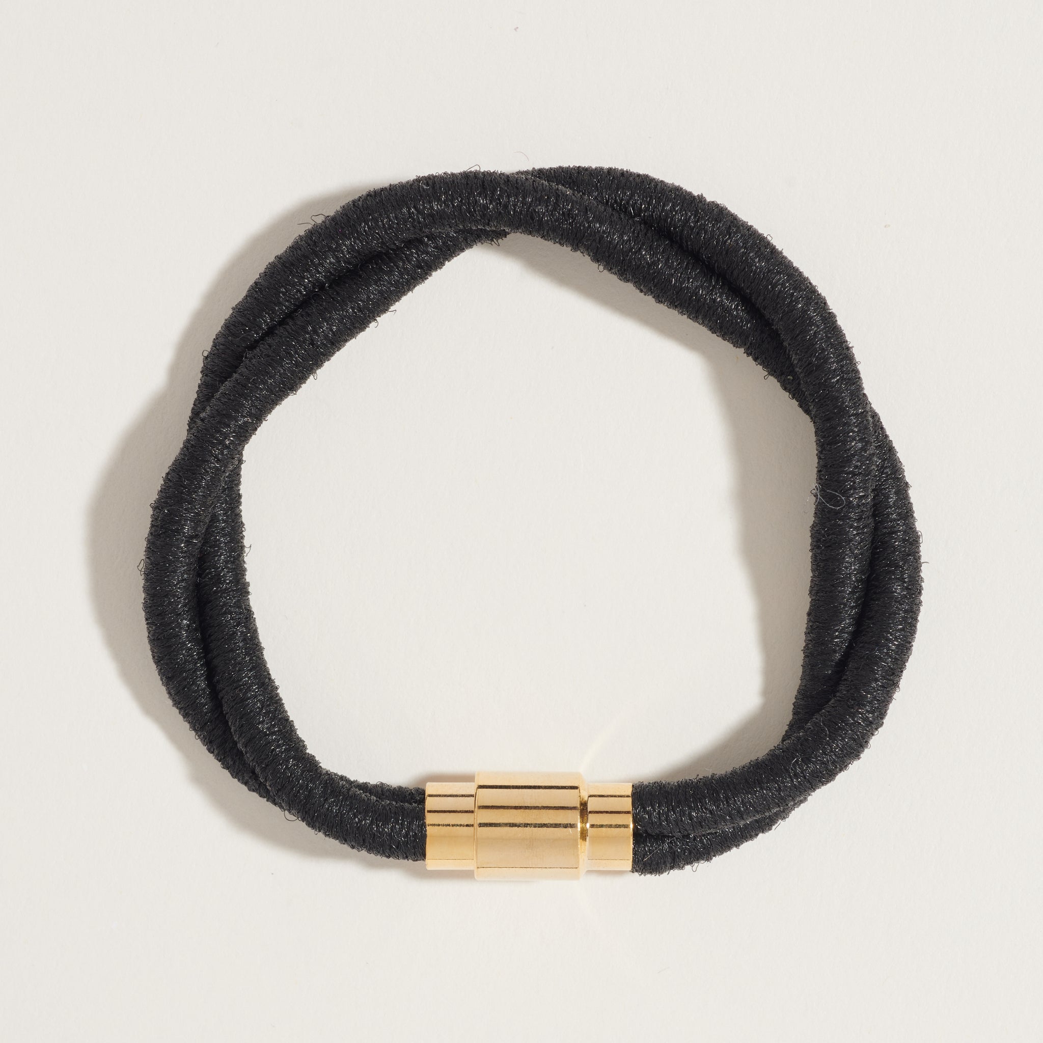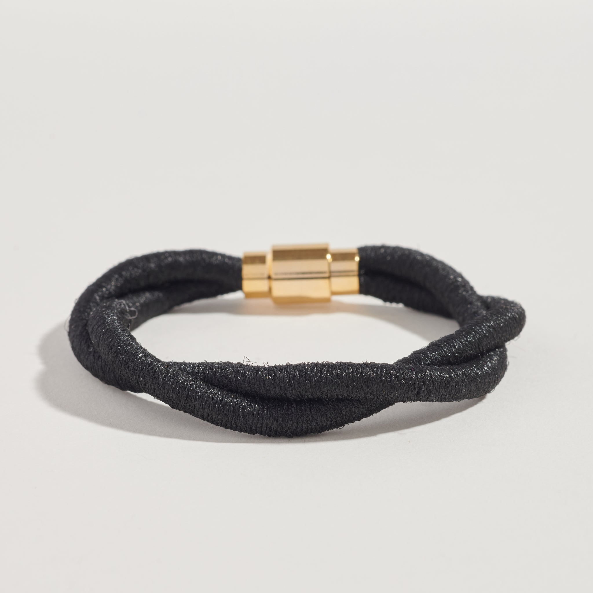 This piece is made with the Shaw Contract 5223D Black yarn and measures 7.5" long. The magnetic clasp is 24K gold-plated brass. Modeled image is for scale only.